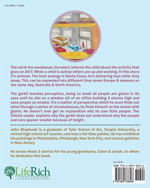 The owl & the woodsman, Dorsdorf, informs the child about the activity that goes on 24/7. When a child is asleep others are up and working. In this story it's animals. The best analogy is Santa Claus; he's delivering toys while they sleep. This can be expanded into different time zones Europe & seasons on the same day, Australia & North America. The gerbil teaches perception, being so small all people are giants in its eyes until he sits on a window sill of an office building 4 stories high and sees people as smaller. It's a matter of perspective which he soon finds out when through a series of circumstances, he finds himself on the street with giants. He doesn't ever get an explanation why he saw little people. The Child/s reader explains why the gerbil does not understand why the people and cars appear smaller because of height.
