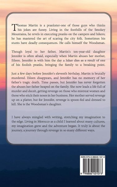 Thomas Martin is a prankster-one of those guys who thinks his jokes are funny. Living in the foothills of the Smokey Mountains, he revels in executing pranks on the campers and hikers; he has mastered the art of scaring the city folk. Sometimes his stunts have deadly consequences. He calls himself the Woodsman. Though loyal to her father, Martin's ten-year-old daughter Jennifer is often afraid, especially when Martin abuses her mother, Eileen. Jennifer is with him the day a hiker dies as a result of one of his foolish pranks, bringing the family to a breaking point. Just a few days before Jennifer's eleventh birthday, Martin is brutally murdered. Eileen disappears, and Jennifer has no memory of her father's tragic death. Time passes, but Jennifer has never forgotten the abuses her father heaped on the family. She now leads a life full of murder and deceit, getting revenge on those who mistreat women and those who stick their noses in her business. Her mother served revenge up on a platter, but for Jennifer, revenge is spoon-fed and dressed to kill. She is the Woodsman's daughter.