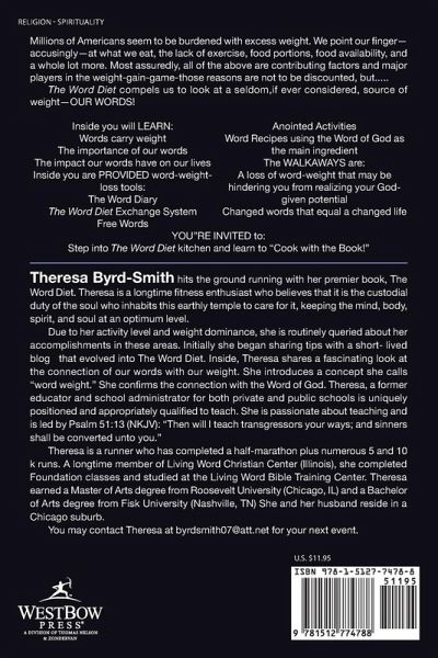Millions of Americans seem to be burdened with excess weight. We point our finger—accusingly—at what we eat, the lack of exercise, food portions, food availability, and a whole lot more. Most assuredly, all of the above are contributing factors and major players in the weight-gain-game-those reasons are not to be discounted, but..... The Word Diet compels us to look at a seldom,if ever considered, source of weight—OUR WORDS! Inside you will LEARN: Words carry weight The importance of our words The impact our words have on our lives Inside you are PROVIDED word-weight-loss tools: The Word Diary The Word Diet Exchange System Free Words Anointed Activities Word Recipes using the Word of God as the main ingredient The WALKAWAYS are: A loss of word-weight that may be hindering you from realizing your God-given potential Changed words that equal a changed life YOU"RE INVITED to: Step into The Word Diet kitchen and learn to "Cook with the Book!"