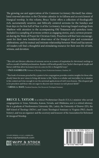 The growing use and appreciation of the Common Lectionary (Revised) has stimulated renewed attention to the Christian calendar in its fullness and an enrichment of liturgical worship. In this volume, Bruce Taylor offers a collection of theologically rich, sacramentally sensitive, and biblically centered sermons for the Sundays and feast days in the first half of Year A of the Lectionary, featuring Gospel readings from Matthew with attention to the accompanying Old Testament and epistolary texts. Included is a sampling of sermons written as engaging stories, and a sermon presented during the Week of Prayer for Christian Unity. Preachers will find here encouragement for their own homiletical observance of the liturgical year and ecumenical celebrations, and the mutual and intimate relationship between Word and Sacrament. All readers will find a thoughtful and stimulating resource for their own life of faith, witness, and devotion.