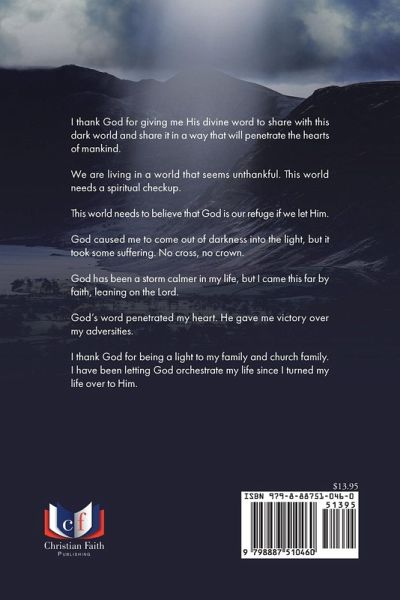 I thank God for giving me His divine word to share with this dark world and share it in a way that will penetrate the hearts of mankind. We are living in a world that seems unthankful. This world needs a spiritual checkup. This world needs to believe that God is our refuge if we let Him. God caused me to come out of darkness into the light, but it took some suffering. No cross, no crown. God has been a storm calmer in my life, but I came this far by faith, leaning on the Lord. God's word penetrated my heart. He gave me victory over my adversities. I thank God for being a light to my family and church family. I have been letting God orchestrate my life since I turned my life over to Him.