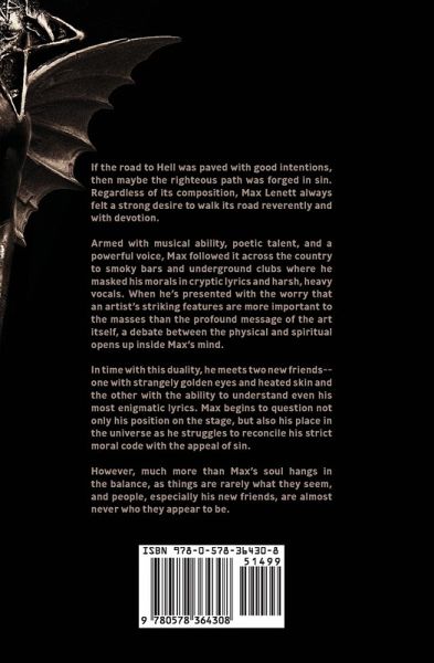 If the road to Hell was paved with good intentions, then maybe the righteous path was forged in sin. Regardless of its composition, Max Lenett always felt a strong desire to walk its road reverently and with devotion. Armed with musical ability, poetic talent, and a powerful voice, Max followed it across the country to smoky bars and underground clubs where he masked his morals in cryptic lyrics and harsh, heavy vocals. When he's presented with the worry that an artist's striking features are more important to the masses than the profound message of the art itself, a debate between the physical and spiritual opens up inside Max's mind. In time with this duality, he meets two new friends-- one with strangely golden eyes and heated skin and the other with the ability to understand even his most enigmatic lyrics. Max begins to question not only his position on the stage, but also his place in the universe as he struggles to reconcile his strict moral code with the appeal of sin. However, much more than Max's soul hangs in the balance, as things are rarely what they seem, and people, especially his new friends, are almost never who they appear to be.