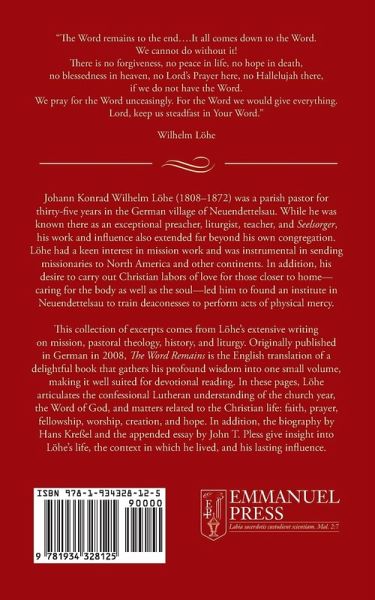 This collection of excerpts comes from Löhe's extensive writing on mission, pastoral theology, history, and liturgy. Originally published in German in 2008, The Word Remains is the English translation of a delightful book that gathers his profound wisdom into one small volume, making it well suited for devotional reading. In these pages, Löhe articulates the confessional Lutheran understanding of the church year, the Word of God, and matters related to the Christian life: faith, prayer, fellowship, worship, creation, and hope. In addition, the biography by Hans Kreßel and the appended essay by John T. Pless give insight into Löhe's life, the context in which he lived, and his lasting influence. Johann Konrad Wilhelm Löhe (1808-1872) was a parish pastor for thirty-five years in the German village of Neuendettelsau. While he was known there as an exceptional preacher, liturgist, teacher, and Seelsorger, his work and influence also extended far beyond his own congregation. Löhe had a keen interest in mission work and was instrumental in sending missionaries to North America and other continents. In addition, his desire to carry out Christian labors of love for those closer to home-caring for the body as well as the soul-led him to found an institute in Neuendettelsau to train deaconesses to perform acts of physical mercy.