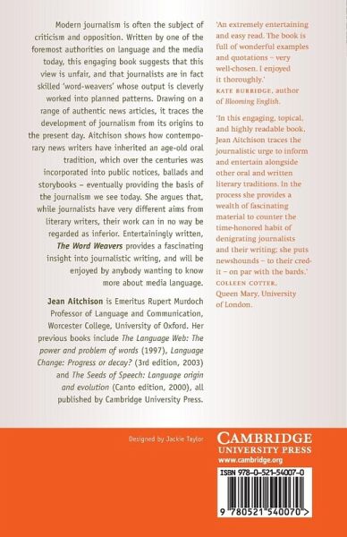 Modern journalism is often the subject of criticism and opposition. Written by one of the foremost authorities on language and the media writing today, this engaging book suggests that view is unfair, and that journalists are in fact skilled 'word weavers' whose output is cleverly worked into planned patterns. Drawing on a range of authentic news articles, it traces the development of journalism from its origins to the present day. Aitchison shows how contemporary news writers have inherited an age-old oral tradition, which over the centuries was incorporated into public notices, ballads and storybooks - eventually providing the basis of the journalism we see today. She argues that, while journalists have very different aims to literary writers, their work can in no way be regarded as inferior. Entertainingly written, The World Weavers provides a fascinating insight into journalistic writing, and will be enjoyed by anybody wanting to know more about media language.