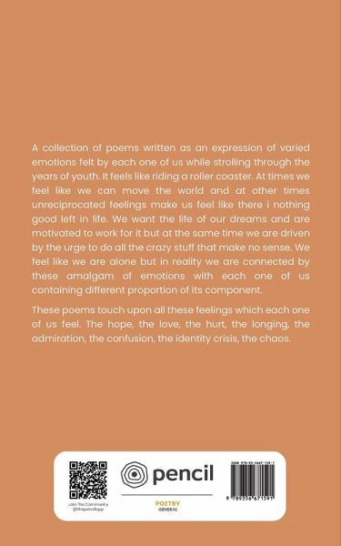 A collection of poems written as an expression of varied emotions felt by each one of us while strolling through the years of youth. It feels like riding a roller coaster. At times we feel like we can move the world and at other times unreciprocated feelings make us feel like there i nothing good left in life. We want the life of our dreams and are motivated to work for it but at the same time we are driven by the urge to do all the crazy stuff that make no sense. We feel like we are alone but in reality we are connected by these amalgam of emotions with each one of us containing different proportion of its component. These poems touch upon all these feelings which each one of us feel. The hope, the love, the hurt, the longing, the admiration, the confusion, the identity crisis, the chaos