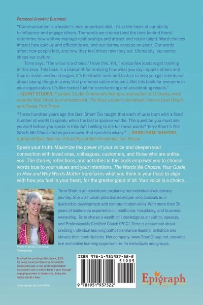 Speak your truth. Maximize the power of your voice and deepen your connection with loved ones, colleagues, customers, and those who are unlike you. The stories, reflections, and activities in this book empower you to choose words true to your values and your intentions. The Words We Choose: Your Guide to How and Why Words Matter transforms what you think in your head to align with how you feel in your heart, for the greater good of all. Your voice is a choice. "Communication is a leader's most important skill. It's at the heart of our ability to influence and engage others. The words we choose (and the tone behind them) determine how well we manage relationships and attract and retain talent. Word choices impact how quickly and efficiently we, and our teams, execute on goals. Our words affect how people feel, and how they feel drives how they act. Ultimately, our words shape our culture. Terre says, 'The voice is a choice.' I love this. Yet, I realize few leaders get training in this area. This book is a blueprint for realizing how what you say impacts others and how to make needed changes. It's filled with tools and tactics to help you get intentional about saying things in a way that promotes optimal impact. Get this book for everyone in your organization. It's like rocket fuel for transforming and accelerating results." -Quint Studer, Founder, Studer Community Institute, and author of 10 books; most recently Wall Street Journal bestseller, The Busy Leader's Handbook: How to Lead People and Places That Thrive "Three hundred years ago the Baal Shem Tov taught that each of us is born with a fixed number of words to speak; when the last is spoken we die. The question you must ask yourself before you speak is this: Am I willing to die for these words? Terre Short's The Words We Choose helps you answer that question wisely." -Rabbi Rami Shapiro, Author of Open Secrets: The Letters of Reb Yerachmiel ben Yisrael To offset the printing of this book, $.05 for every book purchased is donated to TreeSisters.org, a non-profit organization that plants over a million trees a year through engaging women in leadership. Every ten books plants a tree.