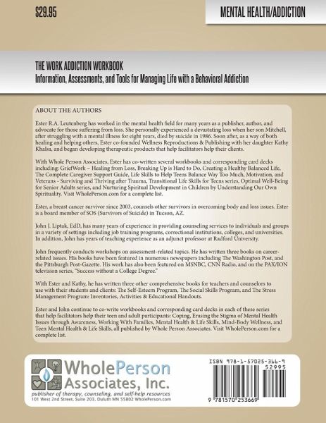 The Work Addiction Workbook provides helping professionals with cognitive and behavioral assessments, tools, and exercises that can be utilized to treat the root causes of work addiction and to help people identify and change negative, unhealthy thoughts and behaviors that may have led to work addiction. Work Addiction Modules This workbook contains five modules of activity-based handouts that will help participants learn more about themselves and their addiction to work. These modules serve as avenues for self-reflection and group experiences revolving around topics of importance in the participants' lives. The activities in this workbook are user-friendly and varied to provide a comprehensive way of analyzing, strengthening, and developing characteristics, skills, and attitudes for overcoming an addiction to work. The activities and handouts in this workbook are reproducible. Minor revisions to suite client or group needs are permitted, but the copyright statement must be retained. Module 1: Psychological Need This module helps participants become aware of and explore the psychological issues that drive them to need to work all the time. They examine how their obsession with work causes problems, including damaged relationships, health problems, and an inability to slow down and enjoy life outside of work. They learn methods to manage psychological needs driving them to overwork, such as low self-esteem, work as a coping mechanism, and approval-seeking behavior. Module 2: My Work Patterns This module helps participants explore and recognize the patterns that lead to a work-related problem. They examine how they live in denial and do not see how their overworking patterns affect them and the people in their lives. They endeavor to become aware of their overworking patterns and how these patterns are often the starting point of their recovery. Module 3: I Have a Problem This module helps participants examine how their work addiction is a maladaptive pattern of excessive behavior that manifests in physiological, psychological, and cognitive symptoms. Participants discuss how their addiction encompasses the same symptoms as someone addicted to a substance. Exercises are included to help them examine the extent of their work addiction. Module 4: Maintain Wellness This module helps participants realize they are at risk of burning out because of their work addiction unless they maintain a sense of wellness. They examine their emotional, physical, and mental exhaustion caused by excessive and prolonged work stress. Activities are included to help them feel less overwhelmed and emotionally drained and to build the ability to cope with the stress of life. Module 5: Work-Life Balance This module helps participants overcome an imbalance between their work and other life roles, such as their personal and family life. They will examine ways to develop a better work-life balance to split their time and energy between work and other vital aspects of life. They will learn tools and techniques for balancing work and life.