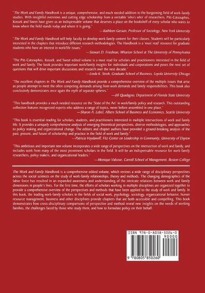 The Work and Family Handbook is a comprehensive edited volume, which reviews a wide range of disciplinary perspectives across the social sciences on the study of work-family relationships, theory, and methods. The changing demographics of the labor force has resulted in an expanded awareness and understanding of the intricate relations between work and family dimensions in people's lives. For the first time, the efforts of scholars working in multiple disciplines are organized together to provide a comprehensive overview of the perspectives and methods that have been applied to the study of work and family. In this book, the leading work-family scholars in the fields of social work, psychology, sociology, organizational behavior, human resource management, business, and other disciplines provide chapters that are both accessible and compelling. This book demonstrates how cross-disciplinary comparisons of perspective and method reveal new insights on the needs of working families, the challenges faced by those who study them, and how to formulate policy on their behalf.