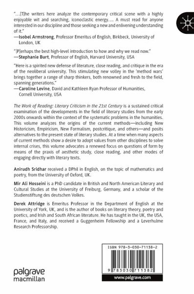 The Work of Reading: Literary Criticism in the 21st Century is a sustained critical examination of the developments in the field of literary studies from the early 2000s onwards within the context of the systematic problems in the humanities. This volume analyzes the origins of the current methods-including New Historicism, empiricism, New Formalism, postcritique, and others-and posits alternatives to the present state of literary studies. At a time when many aspects of current methods show a desire to adopt values from other disciplines to solve internal crises, this volume advocates a renewed focus on questions of form by means of the praxis of aesthetic study, close reading, and other modes of engaging directly with literary texts.