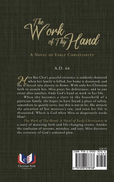 A.D. 66Mira Bat-Chet's peaceful existence is suddenly shattered when her family is killed, her home is destroyed, and she is forced into slavery in Rome. With only her Christian faith to sustain her, Mira prays for deliverance, and in one event after another, finds God's hand at work in her life.When she becomes a slave in the household of a patrician family, she hopes to have found a place of safety, somewhere to quietly serve, but this is not to be. She attracts the attention of her mistress's son, and soon her life is threatened. Where is God when Mira so desperately needs Him?The Work of Thy Hand: A Novel of Early Christianity is a story of maturing faith and life-changing events. Amidst the confusion of sorrows, mistakes, and joys, Mira discovers the certainty of God's ordained plan.