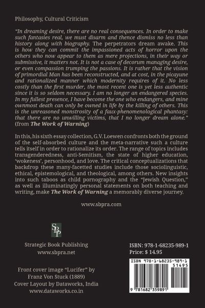 Philosophy, Cultural Criticism "In dreaming desire, there are no real consequences. In order to make such fantasies real, we must disarm and thence dismiss no less than history along with biography. The perpetrators dream awake. This is how they can commit the impassioned acts of horror upon the others who now appear to them as mere projections, in their way or submissive, it matters not. It is not a case of decorum managing desire, or even compassion trumping the passions. It is rather that the vision of primordial Man has been reconstructed, and at cost, in the picayune and rationalized manner which modernity requires of it. No less costly than the first murder, the most recent one is yet less authentic since it is so seldom necessary. I am no longer an endangered species. In my fullest presence, I have become the one who endangers, and mine ownmost death can only be owned in life by the killing of others. This is the unreasoned monstrosity of a faux-phenomenological phantasy: that there are no unwilling victims, that I no longer dream alone." (from The Work of Warning) In this, his sixth essay collection, G.V. Loewen confronts both the ground of the self-absorbed culture and the meta-narrative such a culture tells itself in order to rationalize its order. The range of topics includes transgenderedness, anti-Semitism, the state of higher education, 'wokeness', personhood, and love. The critical conceptualizations that backdrop these many-facetted studies include those sociolinguistic, ethical, epistemological, and theological, among others. New insights into such taboos as child pornography and the "Jewish Question," as well as illuminatingly personal statements on both teaching and writing, make The Work of Warning a memorably diverse journey.