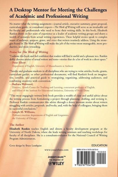 No matter what the writing assignment-journal article, executive summary, grant proposal, curriculum guide, or consultant's report-- The Work of Writing will serve as an invaluable aid for faculty and professionals who need to hone their writing skills. In this book, Elizabeth Rankin draws on her years of experience as a leader of academic writing groups and shares a wealth of scenarios from actual writing experiences. These helpful stories speak to complex issues of audience, purpose, genre, and voice that writers routinely address. Using the strategies found in The Work of Writing will make the job of the writer more manageable, more productive, and more rewarding.