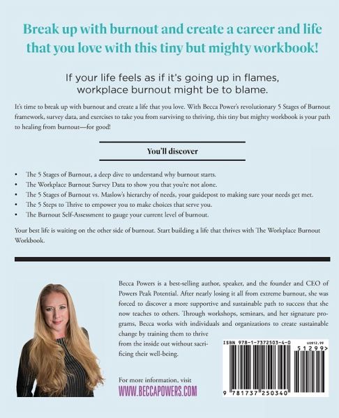 Break up with burnout and create a career and life that you love with this tiny but mighty workbook! If your life feels as if it's going up in flames, workplace burnout might be to blame. Your job eats up all your time and energy, but you still feel unseen, unheard, and unappreciated. At home, you're running on empty. You're not the parent or partner you wish you could be, and your own well-being is an afterthought. Even precious moments of self-care can't make a dent in your stress level. It's time to break up with burnout-and create a career and personal life that you love. With Becca Power's revolutionary 5 Stages of Burnout framework, survey, psychological data, and exercises to take you from surviving to thriving, this mighty workbook is your path to healing from burnout-for good! You'll discoverThe 5 Stages of Burnout, a deep dive into the human psyche to understand why burnout starts and how to identify it. The Workplace Burnout Survey Data of over 8,000 employees in multiple industries, to show you that you're not alone. The 5 Stages of Burnout vs. Maslow's hierarchy of needs, your guidepost to start healing by making sure your needs get met. The 5 Steps to Thrive to empower you to make choices that serve you and start breaking up with burnout. The Burnout Self-Assessment to help you gauge the level of burnout you are currently in. Your best life is waiting on the other side of burnout. Get unstuck and start building a life that thrives with The Workplace Burnout Workbook.