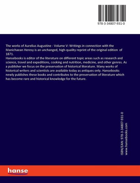 The works of Aurelius Augustine - Volume V: Writings in connection with the Manichaean Heresy is an unchanged, high-quality reprint of the original edition of 1871.Hansebooks is editor of the literature on different topic areas such as research and science, travel and expeditions, cooking and nutrition, medicine, and other genres. As a publisher we focus on the preservation of historical literature. Many works of historical writers and scientists are available today as antiques only. Hansebooks newly publishes these books and contributes to the preservation of literature which has become rare and historical knowledge for the future.