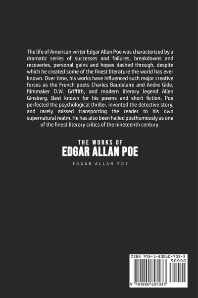 Do you want to read The Works of Edgar Allan Poe? If so then keep reading... The life of American writer Edgar Allan Poe was characterized by a dramatic series of successes and failures, breakdowns and recoveries, personal gains and hopes dashed through, despite which he created some of the finest literature the world has ever known. Over time, his works have influenced such major creative forces as the French poets Charles Baudelaire and Andre Gide, filmmaker D.W. Griffith, and modern literary legend Allen Ginsberg. Best known for his poems and short fiction, Poe perfected the psychological…mehr