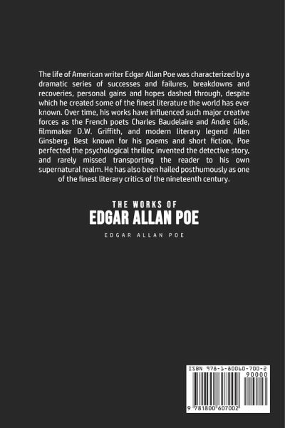 Do you want to read The Works of Edgar Allan Poe? If so then keep reading... The life of American writer Edgar Allan Poe was characterized by a dramatic series of successes and failures, breakdowns and recoveries, personal gains and hopes dashed through, despite which he created some of the finest literature the world has ever known. Over time, his works have influenced such major creative forces as the French poets Charles Baudelaire and Andre Gide, filmmaker D.W. Griffith, and modern literary legend Allen Ginsberg. Best known for his poems and short fiction, Poe perfected the psychological…mehr