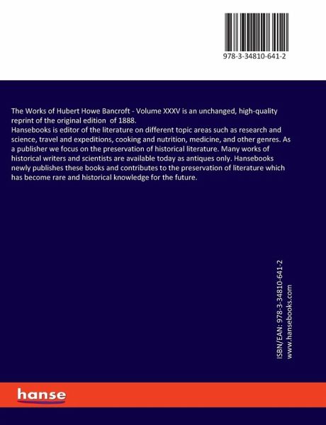 The Works of Hubert Howe Bancroft - Volume XXXV is an unchanged, high-quality reprint of the original edition of 1888.Hansebooks is editor of the literature on different topic areas such as research and science, travel and expeditions, cooking and nutrition, medicine, and other genres. As a publisher we focus on the preservation of historical literature. Many works of historical writers and scientists are available today as antiques only. Hansebooks newly publishes these books and contributes to the preservation of literature which has become rare and historical knowledge for the future.
