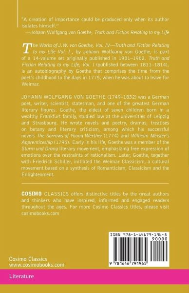 "A creation of importance could be produced only when its author isolates himself." -Johann Wolfgang von Goethe, in Truth and Fiction Relating to my Life The Works of J.W. von Goethe, Vol. IV-Truth and Fiction Relating to my Life Vol. I , by Johann Wolfgang von Goethe, is part of a 14-volume set originally published in 1901-1902. Truth and Fiction Relating to my Life, Vol. I (published between 1811-1814), is an autobiography by Goethe that comprises the time from the poet's childhood to the days in 1775, when he was about to leave for Weimar.