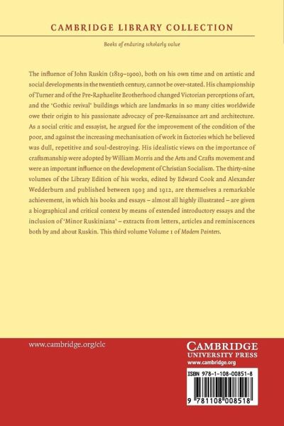 The influence of John Ruskin (1819-1900), both on his own time and on artistic and social developments in the twentieth century, cannot be over-stated. He changed Victorian perceptions of art, and was the main influence behind 'Gothic revival' architecture. As a social critic, he argued for the improvement of the condition of the poor, and against the increasing mechanisation of work in factories, which he believed was dull and soul-destroying. The thirty-nine volumes of the Library Edition of his works, published between 1903 and 1912, are themselves a remarkable achievement, in which his books and essays - almost all highly illustrated - are given a biographical and critical context in extended introductory essays and in the 'Minor Ruskiniana' - extracts from letters, articles and reminiscences both by and about Ruskin. This third volume contains Volume 1 of Modern Painters.