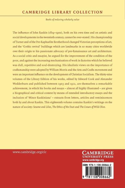 The influence of John Ruskin (1819-1900), both on his own time and on artistic and social developments in the twentieth century, cannot be over-stated. He changed Victorian perceptions of art, and was the main influence behind 'Gothic revival' architecture. As a social critic, he argued for the improvement of the condition of the poor, and against the increasing mechanisation of work in factories, which he believed was dull and soul-destroying. The thirty-nine volumes of the Library Edition of his works, published between 1903 and 1912, are themselves a remarkable achievement, in which his books and essays - almost all highly illustrated - are given a biographical and critical context in extended introductory essays and in the 'Minor Ruskiniana' - extracts from letters, articles and reminiscences both by and about Ruskin. This eighteenth volume contains Ruskin's writings on the nature of society, including Sesame and Lilies.