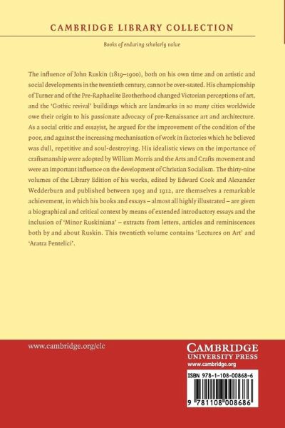 The influence of John Ruskin (1819-1900), both on his own time and on artistic and social developments in the twentieth century, cannot be over-stated. He changed Victorian perceptions of art, and was the main influence behind 'Gothic revival' architecture. As a social critic, he argued for the improvement of the condition of the poor, and against the increasing mechanisation of work in factories, which he believed was dull and soul-destroying. The thirty-nine volumes of the Library Edition of his works, published between 1903 and 1912, are themselves a remarkable achievement, in which his books and essays - almost all highly illustrated - are given a biographical and critical context in extended introductory essays and in the 'Minor Ruskiniana' - extracts from letters, articles and reminiscences both by and about Ruskin. This twentieth volume contains 'Lectures on Art' and 'Aratra Pentelici'.