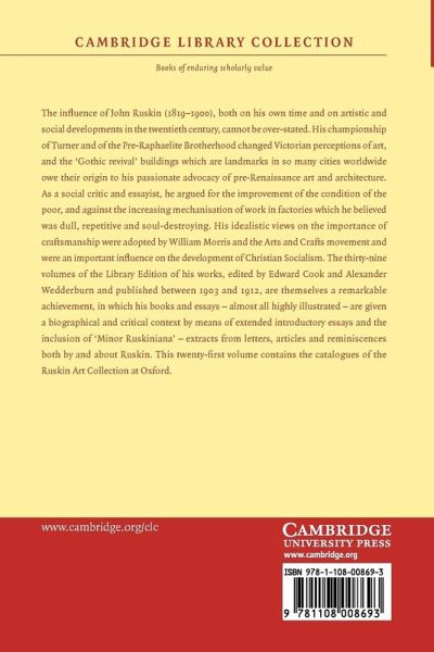 The influence of John Ruskin (1819-1900), both on his own time and on artistic and social developments in the twentieth century, cannot be over-stated. He changed Victorian perceptions of art, and was the main influence behind 'Gothic revival' architecture. As a social critic, he argued for the improvement of the condition of the poor, and against the increasing mechanisation of work in factories, which he believed was dull and soul-destroying. The thirty-nine volumes of the Library Edition of his works, published between 1903 and 1912, are themselves a remarkable achievement, in which his books and essays - almost all highly illustrated - are given a biographical and critical context in extended introductory essays and in the 'Minor Ruskiniana' - extracts from letters, articles and reminiscences both by and about Ruskin. This twenty-first volume contains the catalogues of the Ruskin Art Collection at Oxford.