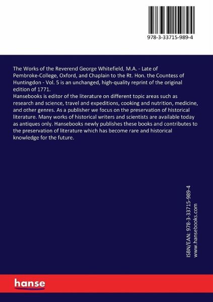 The Works of the Reverend George Whitefield, M.A. - Late of Pembroke-College, Oxford, and Chaplain to the Rt. Hon. the Countess of Huntingdon - Vol. 5 is an unchanged, high-quality reprint of the original edition of 1771.