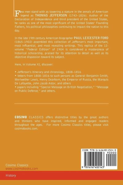 Few men stand with as towering a stature in the annals of American legend as THOMAS JEFFERSON (1743-1826). Author of the Declaration of Independence and third president of the United States, he ranks as one of the most significant of the United States' Founding Fathers, his political philosophies continuing to impact the nation to this day. In the late 19th century American biographer PAUL LEICESTER FORD (1865-1902) assembled this collection of Jefferson's most important, most influential, and most revealing writings. This replica of the 12-volume "Federal Edition" of 1904 is considered a masterpiece of historical scholarship, praised for its attention to detail as well as its objective dispassion toward its subject. Here, in Volume XI, discover: ¿ Jefferson's itinerary and chronology, 1808-1816 ¿ letters from 1808-1816 to such persons as General Benjamin Smith, Meriwether Lewis, Henry Dearborn, the Emperor of Russia, the Marquis De Lafayette, John Jacob Astor, and others ¿ papers including "Special Message on British Negotiation," "Message on Public Defence," and others.