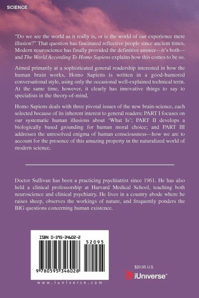 "Do we see the world as it really is, or is the world of our experience mere illusion?" That question has fascinated reflective people since ancient times. Modern neuroscience has finally provided the definitive answer -- it's both -- and The World According To Homo Sapiens explains how this comes to be so. Aimed primarily at a sophisticated general readership interested in how the human brain works, Homo Sapiens is written in a good-humored conversational style, using only the occasional well-explained technical term. At the same time, however, it clearly has innovative things to say to specialists in the theory-of-mind. Homo Sapiens deals with three pivotal issues of the new brain-science, each selected because of its inherent interest to general readers: PART I focuses on our systematic human illusions about 'What Is'; PART II develops a biologically based grounding for human moral choice; and PART III addresses the unresolved enigma of human consciousness -- how we are to account for the presence of this amazing property in the naturalized world of modern science.
