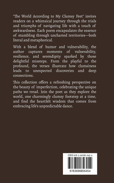 "The World According to My Clumsy Feet" invites readers on a whimsical journey through the trials and triumphs of navigating life with a touch of awkwardness. Each poem encapsulates the essence of stumbling through uncharted territories-both literal and metaphorical. With a blend of humor and vulnerability, the author captures moments of vulnerability, resilience, and serendipity sparked by those delightful missteps. From the playful to the profound, the verses illustrate how clumsiness leads to unexpected discoveries and deep connections. This collection offers a refreshing perspective on the beauty of imperfection, celebrating the unique paths we tread. Join the poet as they explore the world, one charmingly clumsy footstep at a time, and find the heartfelt wisdom that comes from embracing life's unpredictable dance.