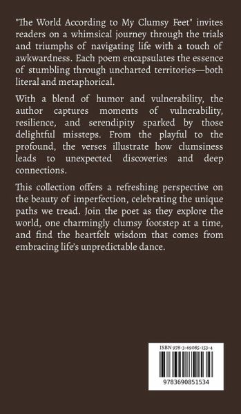 "The World According to My Clumsy Feet" invites readers on a whimsical journey through the trials and triumphs of navigating life with a touch of awkwardness. Each poem encapsulates the essence of stumbling through uncharted territories-both literal and metaphorical. With a blend of humor and vulnerability, the author captures moments of vulnerability, resilience, and serendipity sparked by those delightful missteps. From the playful to the profound, the verses illustrate how clumsiness leads to unexpected discoveries and deep connections. This collection offers a refreshing perspective on the beauty of imperfection, celebrating the unique paths we tread. Join the poet as they explore the world, one charmingly clumsy footstep at a time, and find the heartfelt wisdom that comes from embracing life's unpredictable dance.