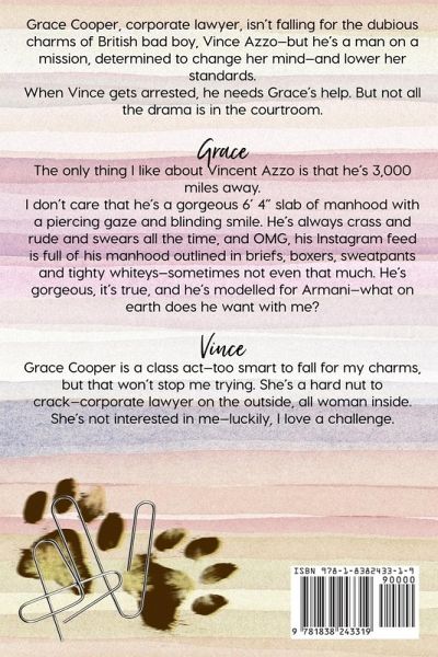 Grace Cooper, corporate lawyer, isn't falling for the dubious charms of British bad boy, Vince Azzo-but he's a man on a mission, determined to change her mind-and lower her standards. When Vince gets arrested for breaking into an animal shelter, he needs Grace's help. But not all the drama is in the courtroom. Grace The only thing I like about Vincent Azzo is that he's 3,000 miles away. I don't care that he's a gorgeous 6' 4" slab of manhood with a piercing gaze and blinding smile. He's always crass and rude and swears all the time, and OMG, his Instagram feed is full of his manhood outlined in briefs, boxers, sweatpants and tighty whiteys-sometimes not even that much. He's gorgeous, it's true, and he's modelled for Armani-what on earth does he want with me? Vince Grace Cooper is a class act-too smart to fall for my charms, but that won't stop me trying. She's a hard nut to crack-corporate lawyer on the outside, all woman inside. She's not interested in me-luckily, I love a challenge.