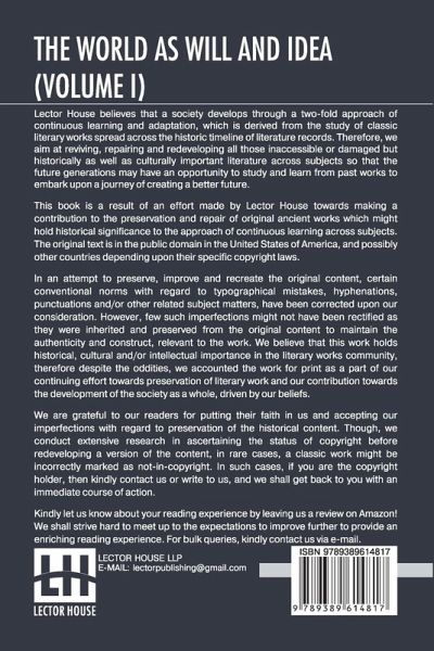 The World As Will And Idea (Volume I): Translated From The German By R. B. Haldane, M.A. And J. Kemp, M.A.; In Three Volumes - Vol. I. This book is a result of an effort made by us towards making a contribution to the preservation and repair of original classic literature. In an attempt to preserve, improve and recreate the original content, we have worked towards: 1. Type-setting & Reformatting: The complete work has been re-designed via professional layout, formatting and type-setting tools to re-create the same edition with rich typography, graphics, high quality images, and table elements, giving our readers the feel of holding a 'fresh and newly' reprinted and/or revised edition, as opposed to other scanned & printed (Optical Character Recognition - OCR) reproductions. 2. Correction of imperfections: As the work was re-created from the scratch, therefore, it was vetted to rectify certain conventional norms with regard to typographical mistakes, hyphenations, punctuations, blurred images, missing content/pages, and/or other related subject matters, upon our consideration. Every attempt was made to rectify the imperfections related to omitted constructs in the original edition via other references. However, a few of such imperfections which could not be rectified due to intentional\unintentional omission of content in the original edition, were inherited and preserved from the original work to maintain the authenticity and construct, relevant to the work. We believe that this work holds historical, cultural and/or intellectual importance in the literary works community, therefore despite the oddities, we accounted the work for print as a part of our continuing effort towards preservation of literary work and our contribution towards the development of the society as a whole, driven by our beliefs. We are grateful to our readers for putting their faith in us and accepting our imperfections with regard to preservation of the historical content. HAPPY READING!
