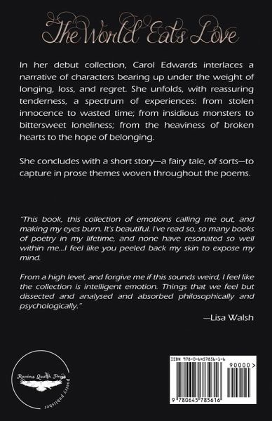 In her debut collection, Carol Edwards interlaces a narrative of characters bearing up under the weight of longing, loss, and regret. She unfolds, with reassuring tenderness, a spectrum of experiences: from stolen innocence to wasted time; from insidious monsters to bittersweet loneliness; from the heaviness of broken hearts to the hope of belonging. She concludes with a short story-a fairy tale, of sorts-to capture in prose themes woven throughout the poems.