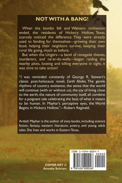 When the bombs fell and Western civilization ended, the residents of Hickory Hollow, Texas, scarcely noticed the difference. They were already used to fending for themselves--growing their own food, helping their neighbors survive, keeping their rural life going, much as before. But when the Ungers--a band of renegade thieves, murderers, and ne'er-do-wells--began raiding the nearby plots, looting and killing everyone in sight, it was time to take action! "I was reminded constantly of George R. Stewart's classic post-holocaust novel, Earth Abides. The gentle rhythms of country existence, the sense that the world will continue (with or without us), the joy of living close to the earth, the nature of community itself, all combine for a poignant tale celebrating the best of what it means to be human. In Mayhar's perceptive eyes, the World Begins in Hickory Hollow." --Robert Reginald.