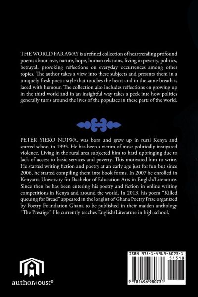 THE WORLD FAR AWAY is a refi ned collection of heartrending profound poems about love, nature, hope, human relations, living in poverty, politics, betrayal, provoking refl ections on everyday occurrences among other topics. Th e author takes a view into these subjects and presents them in a uniquely fresh poetic style that touches the heart and in the same breath is laced with humour. Th e collection also includes refl ections on growing up in the third world and in an insightful way takes a peek into how politics generally turns around the lives of the populace in these parts of the world.