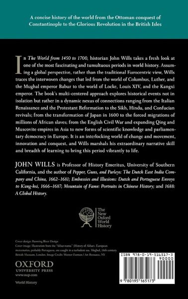 In The World from 1450 to 1700, historian John Wills takes a fresh look at one of the most fascinating and tumultuous periods in world history. Assuming a global perspective, rather than the traditional Eurocentric view, Wills traces the interwoven changes that led from the world of Columbus, Luther, and the Mughal emperor Babur to the world of Locke, Louis XIV, and the Kangxi emperor. The book's multi-centered approach explores historical events not in isolation but rather in a dynamic nexus of connections ranging from the Italian Renaissance and the Protestant Reformation to the Sikh, Hindu, and Confucian revivals; from the transformation of Japan in 1600 to the forced migrations of millions of African slaves; from the English Civil War and expanding Qing and Muscovite empires in Asia to new forms of scientific knowledge and parliamentary democracy in Europe. It is an interlocking world of change and movement, innovation and conquest, and Wills marshals his extraordinary narrative skill and breadth of learning to bring this period vibrantly to life.
