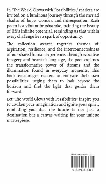 In "The World Glows with Possibilities," readers are invited on a luminous journey through the myriad shades of hope, wonder, and introspection. Each poem is a vibrant brushstroke, painting the beauty of life's infinite potential, reminding us that within every challenge lies a spark of opportunity. The collection weaves together themes of aspiration, resilience, and the interconnectedness of our shared human experience. Through evocative imagery and heartfelt language, the poet explores the transformative power of dreams and the illumination found in everyday moments. This book encourages readers to embrace their own possibilities, urging them to look beyond the horizon and find the light that guides them forward. Let "The World Glows with Possibilities" inspire you to awaken your imagination and ignite your spirit, reminding you that the future is not just a destination but a canvas waiting for your unique masterpiece.