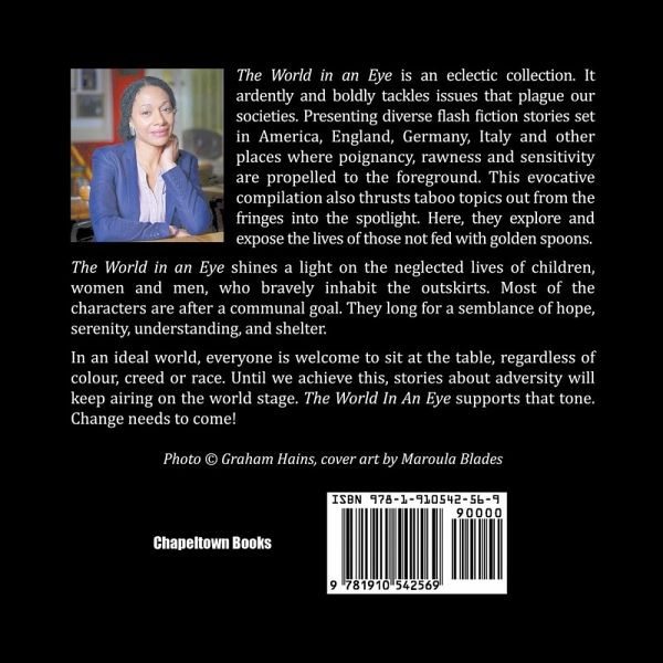 The World In An Eye is an eclectic collection. It ardently and boldly tackles issues that plague our societies. Presenting diverse flash fiction stories set in America, England, Germany, Italy and other places where poignancy, rawness and sensitivity are propelled to the foreground. This evocative compilation also thrusts taboo topics out from the fringes into the spotlight. Here, they explore and expose the lives of those not fed with golden spoons. The World In An Eye shines a light on the neglected lives of children, women and men, who bravely inhabit the outskirts. Most of the characters are after a communal goal. They long for a semblance of hope, serenity, understanding, and shelter. In an ideal world, everyone is welcome to sit at the table, regardless of colour, creed or race. Until we achieve this, stories about adversity will keep airing on the world stage. The World In An Eye supports that tone. Change needs to come!