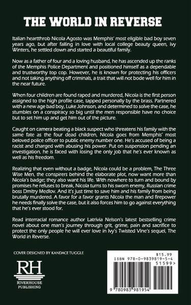 Italian heartthrob Nicola Agosto was Memphis' most eligible bad boy seven years ago, but after falling in love with local college beauty queen, Ivy Winters, he settled down and started a beautiful family. Now as a father of four and a loving husband, he has ascended up the ranks of the Memphis Police Department and positioned himself as a dependable and trustworthy top cop. However, he is known for protecting his officers and not taking anything off criminals, a trait that will not bode well for him in the near future. When four children are found raped and murdered, Nicola is the first person assigned to the high profile case, tapped personally by the brass. Partnered with a new age bad boy, Luke Johnson, and determined to solve the case, he stumbles on a conspiracy so big until the men responsible have no choice but to set him up and get him out of the picture. Caught on camera beating a black suspect who threatens his family with the same fate as the four dead children, Nicola goes from Memphis' most beloved police officer to public enemy number one. He's accused of being a racist and charged with abusing his power. Put on suspension pending an investigation, he is faced with losing the only job that he's ever known as well as his freedom. Realizing that even without a badge, Nicola could be a problem, The Three Wise Men, the conspirers behind the elaborate plot, now want more than Nicola's badge; they also want his life. With nowhere to turn and bound by promises he refuses to break, Nicola turns to his sworn enemy, Russian crime boss Dmitry Medlov. And it's just time to save him and his family from being brutally murdered. A favor for a favor grants Nicola the man and firepower he needs finally solve the case, but it also forces him to go against everything that he's ever stood for. Read interracial romance author Latrivia Nelson's latest bestselling crime novel about one man's journey through grit, grime, pain and sacrifice to protect the only people he will ever love in Ivy's Twisted Vine's sequel, The World in Reverse.