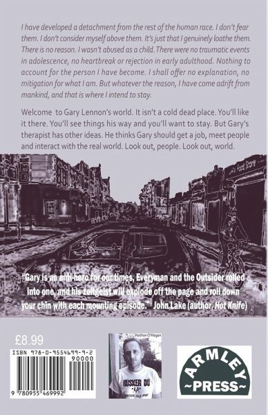 I have developed a detachment from the rest of the human race. I don't fear them. I don't consider myself above them. It's just that I genuinely loathe them. There is no reason. I wasn't abused as a child. There were no traumatic events in adolescence, no heartbreak or rejection in early adulthood. Nothing to account for the person I have become. I shall offer no explanation, no mitigation for what I am. But whatever the reason, I have come adrift from mankind, and that is where I intend to stay. Welcome to Gary Lennon's world. It isn't a cold dead place. You'll like it there. You'll see things his way and you'll want to stay. But Gary's therapist has other ideas. He thinks Gary should get a job, meet people and interact with the real world. Look out, people. Look out, world. "Gary is an anti-hero for our times, Everyman and the Outsider rolled into one, and his zeitgeist will explode off the page and roll down your chin with each mounting episode." John Lake (author, Hot Knife)