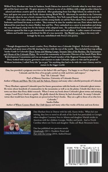 Wilfred Perry Eberhart was born in Yankton, South Dakota but moved to Colorado when he was three years old and his heart never left..He grew up poor in Denver as one of six children with a single mother whom he adored and whose creative spirit he absorbed. After graduating from East High School, he enlisted in the Navy and spent two years in the Pacific theater during World War II. Afterward, he enrolled at the University of Colorado where he met a lovely woman from Brooklyn, New York named Sandy and they were married in 1949. Son Dan came along soon after and the young family set sail for Paris where Perry studied at the Sorbonne and found his muse as a writer. They returned in time for number two son, Peter whose birth was followed few years later by sisters Medley Ann and Eve Perry embarked on a career in journalism and along the way, developed a deep love for the history of his adopted state..He authored four books about Colorado and doors opened for him to get intrinsically involved in state and local affairs. A roller coaster of successes, failures and health issues underlined the life of a true maverick. The World Lost a Man is his story told lovingly by his son, embellished with Perry's own poetry.