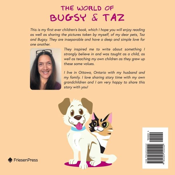 This is my first ever children's book, which I hope you will enjoy reading as well as sharing the pictures taken by myself, of my dear pets, Taz and Bugsy. They are inseparable and have a deep and simple love for one another. They inspired me to write about something I strongly believe in and was taught as a child, as well as teaching my own children as they grew up these same values.