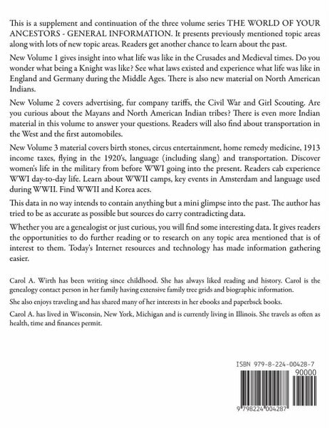 This is a supplement and continuation of the three volume series THE WORLD OF YOUR ANCESTORS - GENERAL INFORMATION. It presents previously mentioned topic areas along with lots of new topic areas. Readers get another chance to learn about the past. New Volume 1 gives insight into what life was like in the Crusades and Medieval times. Do you wonder what being a Knight was like? See what laws existed and experience what life was like in England and Germany during the Middle Ages. There is also new material on North American Indians. New Volume 2 covers advertising, fur company tariffs, the Civil War and Girl Scouting. Are you curious about the Mayans and North American Indian tribes? There is even more Indian material in this volume to answer your questions. Readers will also find about transportation in the West and the first automobiles. New Volume 3 material covers birth stones, circus entertainment, home remedy medicine, 1913 income taxes, flying in the 1920's, language (including slang) and transportation. Discover women's life in the military from before WWI going into the present. Readers cab experience WWI day-to-day life. Learn about WWII camps, key events in Amsterdam and language used during WWII. Find WWII and Korea aces. This data in no way intends to contain anything but a mini glimpse into the past. The author has tried to be as accurate as possible but sources do carry contradicting data. Whether you are a genealogist or just curious, you will find some interesting data. It gives readers the opportunities to do further reading or to research on any topic area mentioned that is of interest to them. Today's Internet resources and technology has made information gathering easier.