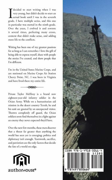 Private Taylor McElroy is a brand new eighteen-year-old infantry soldier in the Ocian Army. While on a humanitarian aid mission in the desert country Terrah, he and his unit are greeted by an unexpected visitor. Thrown completely off guard, the Ocians soldiers soon find themselves in a fight against an enemy they never expected they'd have. Over the next few months, these men discover that a threat far greater than anything the world has seen yet is emerging; politics and diplomacy isn't enough. Teamwork, sacrifice, and patriotism are the only factors that decide the fate of a world on edge.