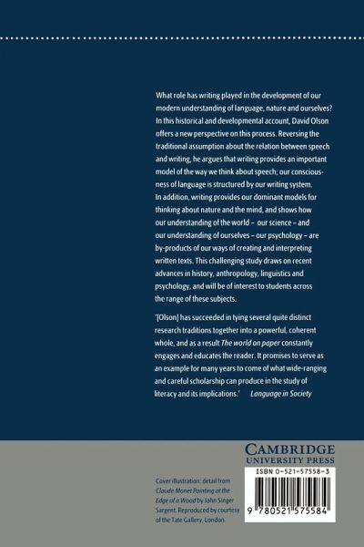 What role has writing played in the development of our modern understanding of language, nature, and ourselves? In the historical and developmental account, David Olson offers a new perspective on this process. Reversing the traditional assumption about the relation between speech and writing, he argues that writing provides an important model of the way we think about speech; that our consciousness of language is structured by our writing system. In addition, he argues that writing provides our dominant models for thinking about nature and the mind, and shows how our understanding of the world and our understanding of ourselves are by-products of our ways of creating and interpreting written texts. This challenging study draw in recent advances in history, anthropology, linguistics, and psychology.
