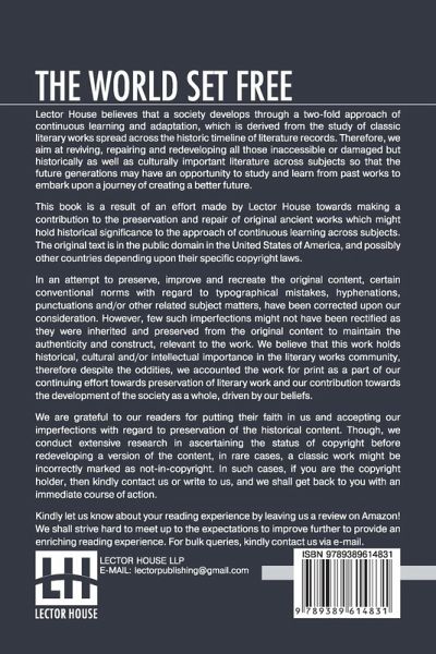 The World Set Free This book is a result of an effort made by us towards making a contribution to the preservation and repair of original classic literature. In an attempt to preserve, improve and recreate the original content, we have worked towards: 1. Type-setting & Reformatting: The complete work has been re-designed via professional layout, formatting and type-setting tools to re-create the same edition with rich typography, graphics, high quality images, and table elements, giving our readers the feel of holding a 'fresh and newly' reprinted and/or revised edition, as opposed to other scanned & printed (Optical Character Recognition - OCR) reproductions. 2. Correction of imperfections: As the work was re-created from the scratch, therefore, it was vetted to rectify certain conventional norms with regard to typographical mistakes, hyphenations, punctuations, blurred images, missing content/pages, and/or other related subject matters, upon our consideration. Every attempt was made to rectify the imperfections related to omitted constructs in the original edition via other references. However, a few of such imperfections which could not be rectified due to intentional\unintentional omission of content in the original edition, were inherited and preserved from the original work to maintain the authenticity and construct, relevant to the work. We believe that this work holds historical, cultural and/or intellectual importance in the literary works community, therefore despite the oddities, we accounted the work for print as a part of our continuing effort towards preservation of literary work and our contribution towards the development of the society as a whole, driven by our beliefs. We are grateful to our readers for putting their faith in us and accepting our imperfections with regard to preservation of the historical content. HAPPY READING!