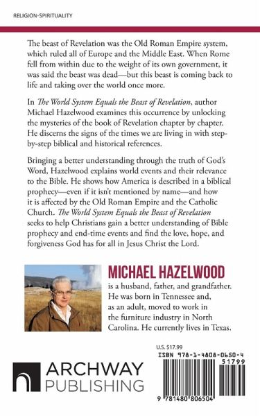 The beast of Revelation was the Old Roman Empire system, which ruled all of Europe and the Middle East. When Rome fell from within due to the weight of its own government, it was said the beast was dead-but this beast is coming back to life and taking over the world once more. In The World System Equals the Beast of Revelation, author Michael Hazelwood examines this occurrence by unlocking the mysteries of the book of Revelation chapter by chapter. He discerns the signs of the times we are living in with step-by-step biblical and historical references. Bringing a better understanding through the truth of God's Word, Hazelwood explains world events and their relevance to the Bible. He shows how America is described in a biblical prophecy-even if it isn't mentioned by name-and how it is affected by the Old Roman Empire and the Catholic Church. The World System Equals the Beast of Revelation seeks to help Christians gain a better understanding of Bible prophecy and end-time events and find the love, hope, and forgiveness God has for all in Jesus Christ the Lord.