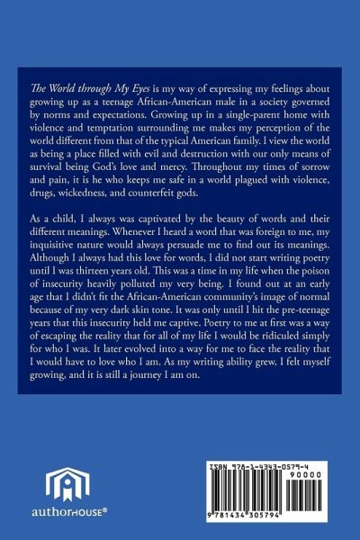 The World through My Eyes is my way of expressing my feelings about growing up as a teenage African-American male in a society governed by norms and expectations. Growing up in a single-parent home with violence and temptation surrounding me makes my perception of the world different from that of the typical American family. I view the world as being a place filled with evil and destruction with our only means of survival being God's love and mercy. Throughout my times of sorrow and pain, it is he who keeps me safe in a world plagued with violence, drugs, wickedness, and counterfeit gods. As a child, I always was captivated by the beauty of words and their different meanings. Whenever I heard a word that was foreign to me, my inquisitive nature would always persuade me to find out its meanings. Although I always had this love for words, I did not start writing poetry until I was thirteen years old. This was a time in my life when the poison of insecurity heavily polluted my very being. I found out at an early age that I didn't fit the African-American community's image of normal because of my very dark skin tone. It was only until I hit the pre-teenage years that this insecurity held me captive. Poetry to me at first was a way of escaping the reality that for all of my life I would be ridiculed simply for who I was. It later evolved into a way for me to face the reality that I would have to love who I am. As my writing ability grew, I felt myself growing, and it is still a journey I am on.