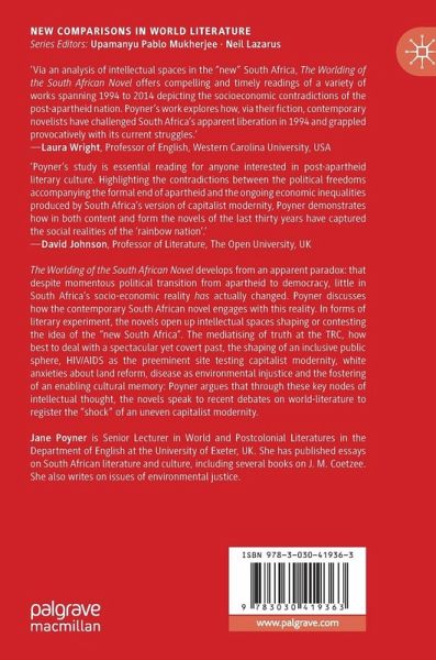 The Worlding of the South African Novel develops from something of a paradox: that despite momentous political transition from apartheid to democracy, little in South Africa's socio-economic reality has actually changed. Poyner discusses how the contemporary South African novel engages with this reality. In forms of literary experiment, the novels open up intellectual spaces shaping or contesting the idea of the "new South Africa". The mediatising of truth at the TRC hearings, how best to deal with a spectacular yet covert past, the shaping for "unimagined communities" of an inclusive public sphere, HIV/AIDS as the preeminent site testing capitalist modernity, white anxieties about land reform, disease as environmental injustice and the fostering of an enabling restorative cultural memory: Poyner argues that through these key nodes of intellectual thought, the novels speak to recent debates on world-literature to register the "shock" of an uneven modernity produced bya capitalist world economy.